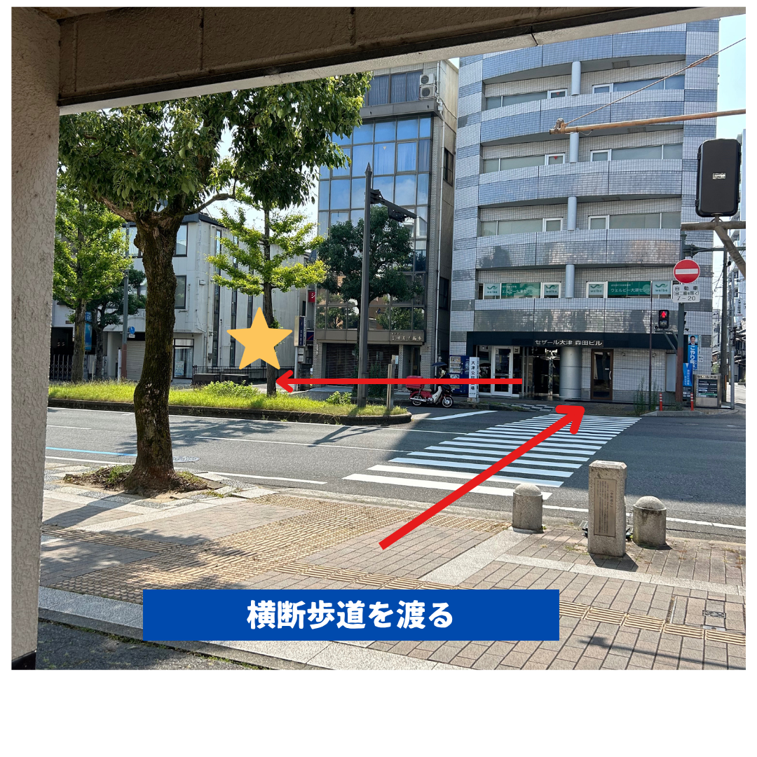 ②駐車後、大通り方面に進んで、 横断歩道を渡ってください。